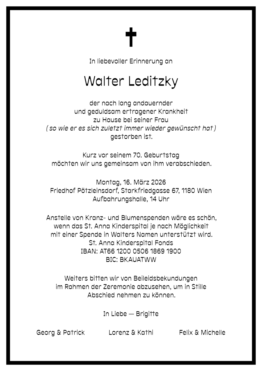 Mit großer Betroffenheit und in tiefer Traurigkeit nehmen wir Abschied von Oberstudienrat Mag. Walter Leditzky, der Anfang März 2026, wenige Tage vor seinem 70. Geburtstag, nach langer, geduldig ertragener Krankheit verstorben ist.
