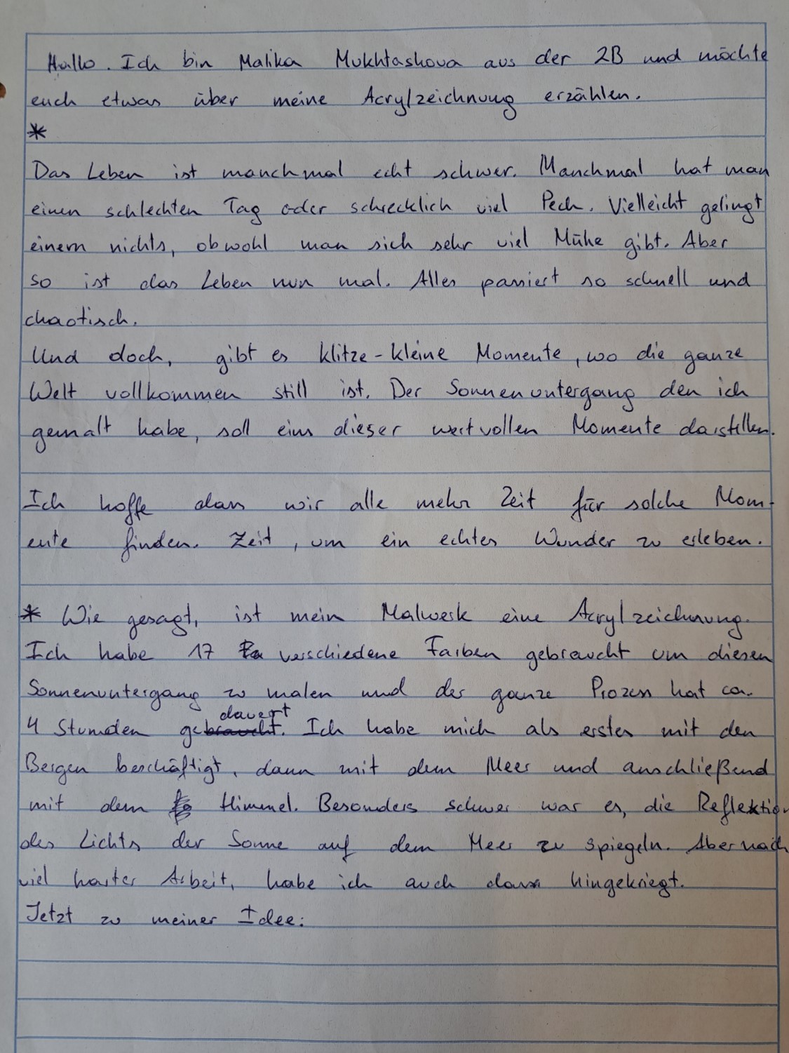 "Das Paradies beginnt dort, wo Menschen sich sehen. Wo jemand nicht weghört. Wo einer dem anderen Würde gibt." Leon (8c) |