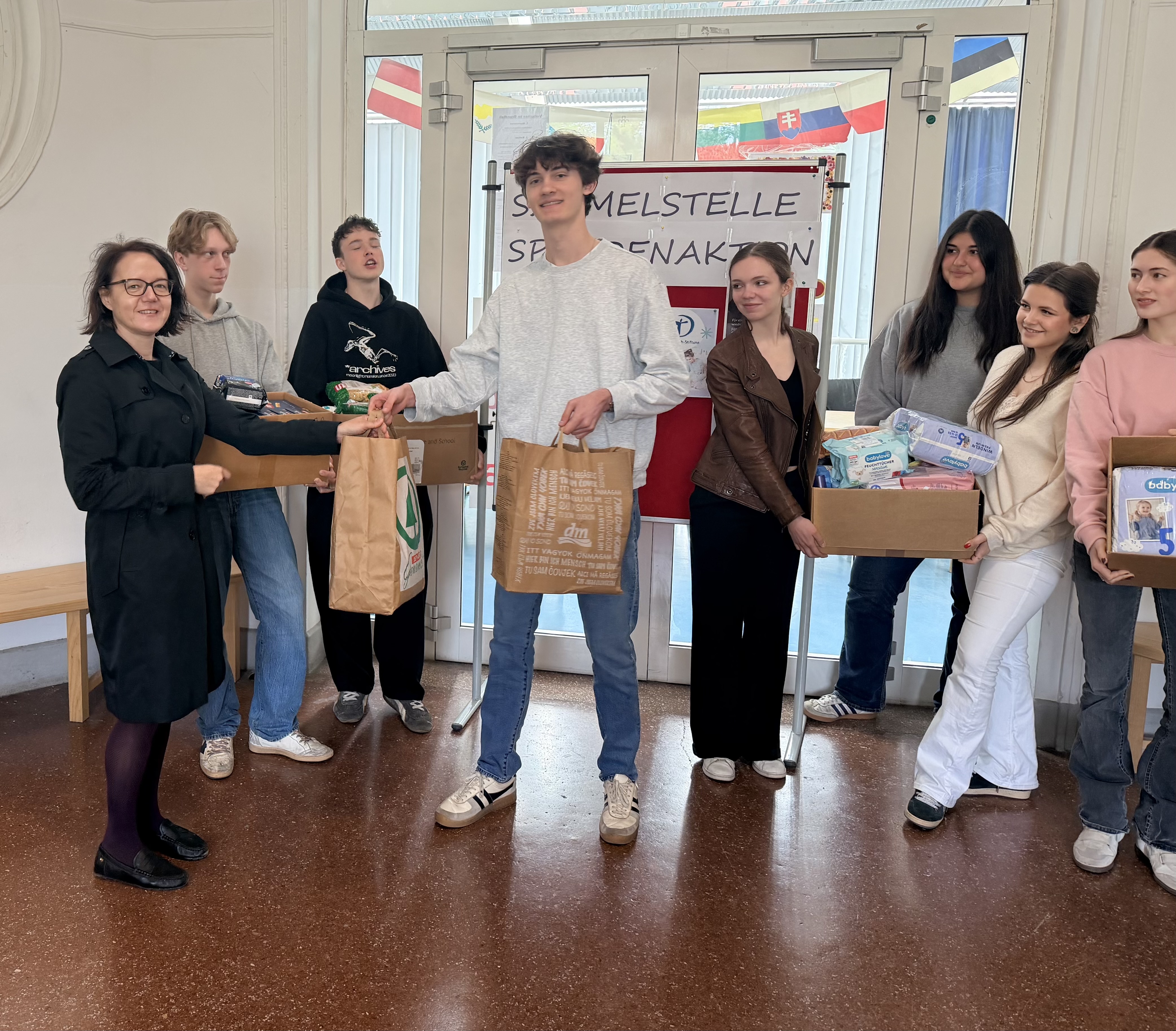 Für diese wurde von den Schüler:innen der 8B um Windeln, Hygieneartikel, haltbare Lebensmittel und vieles mehr gebeten und drei Wochen lang in den Pausen von allen Mitgliedern der Schulgemeinschaft entgegengenommen.