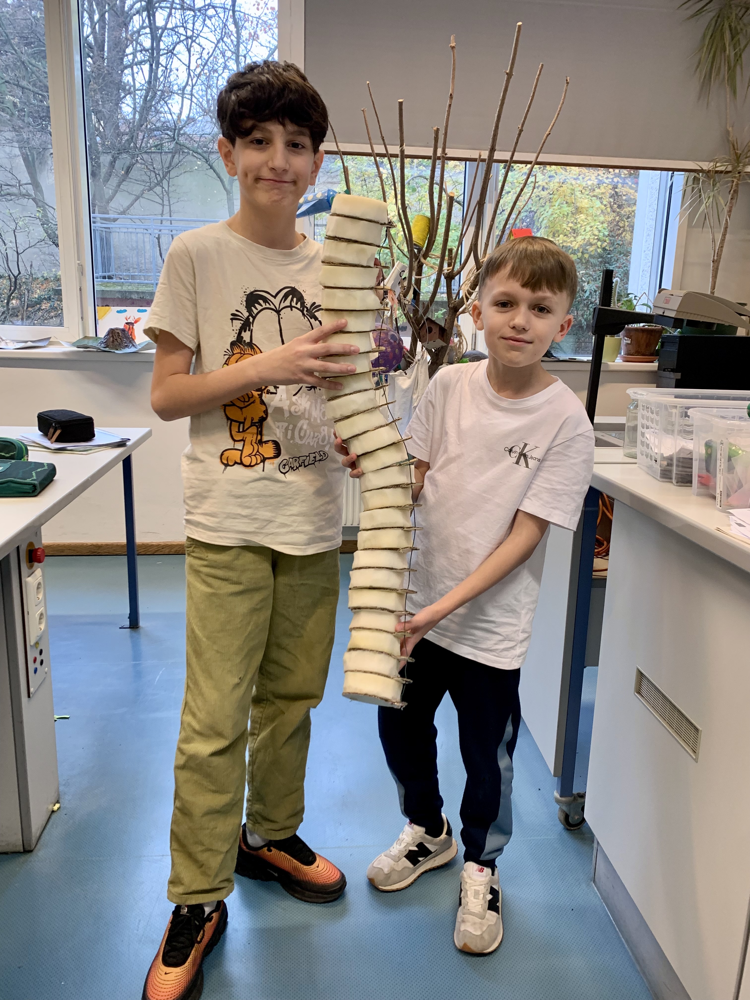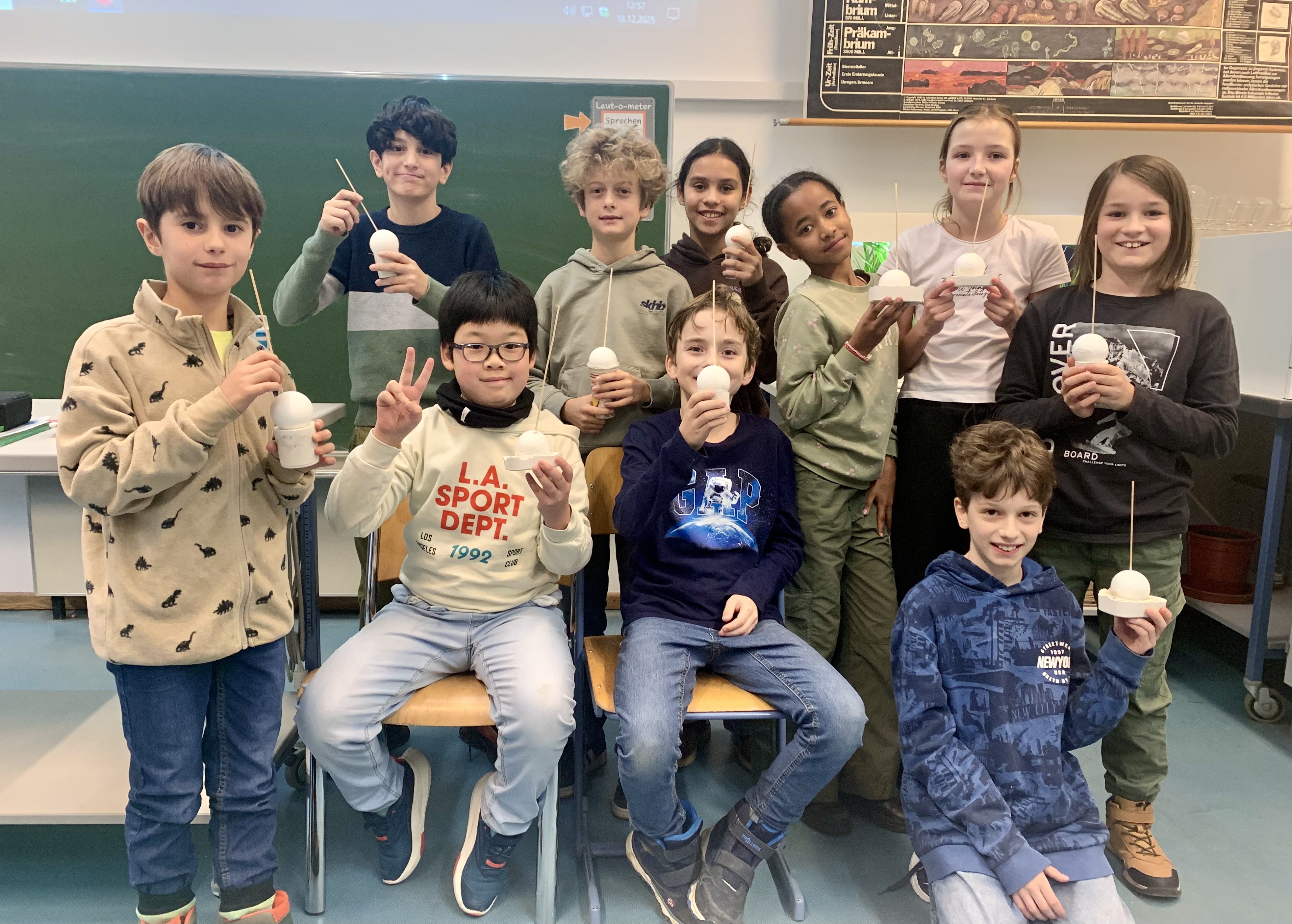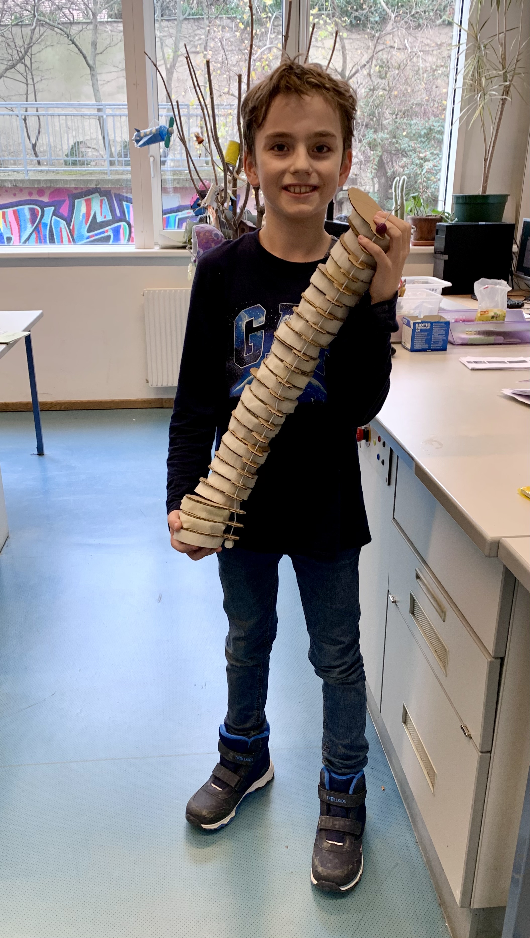 Dazu haben wir Wirbelsäulen aus Schaumstoff und Karton gebastelt. So konnten wir gut sehen, warum die Wirbelsäule beweglich ist und trotzdem stabil bleibt. Außerdem haben wir aus Gips Kugelgelenke modelliert. Dadurch wurde uns klar, in welche Richtungen sich Arme und Beine bewegen können.