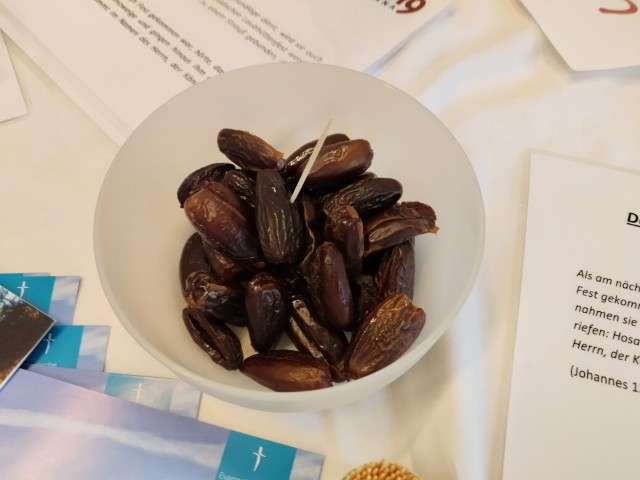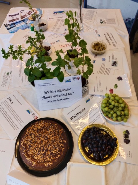 Oliven, Datteln, Weintrauben (weiß/rot), Minze, Rosenweihrauch, Maulbeere, Lilie laden zu den vorbereiten Rätselfragen biblischer Pflanzenwelt mit allen Sinnen wie zur Verkostung ein. |