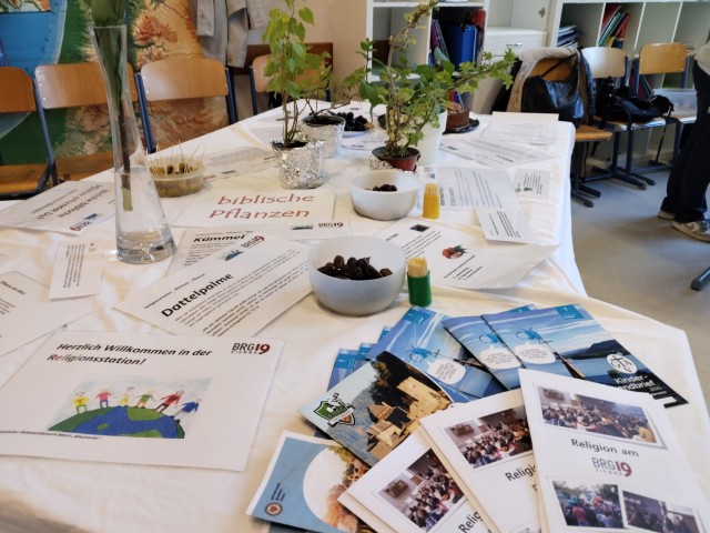 Viele engagierte wie kreative Schülerinnen und Schüler der Religionsgruppen am BRG19 (evang.A.B. und H.B.; röm.kath., muslimisch) bereiteten mit großem Einsatz den Tag der Wiener Schulen/Tag der offenen Tür am BRG19 vor und luden unsere kleinen und großen Besucher:innen zu einer Rätselrallye in der Welt der Religion mit den Schwerpunkten biblische Pflanzenwelt/Küche, Schriften und Sprache der Religionen wie zu einem biblischen/regionalen Buffet ein.